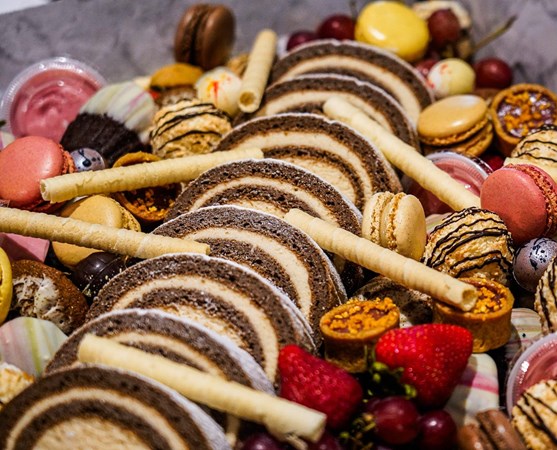 Dessert Grazing Box includes white chocolate & peppermint madelaine, pomegranate curd & orange tart, tiramisu cookies, coconut macaroons, French macarons, chocolate & chestnut moussse rolls, cranberry ganache, cigar wafer rolls, fresh strawberries, fresh grapes.