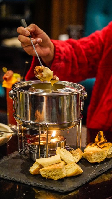 Cheese fondue: Enjoy a warm, creamy cheese fondue served with grilled focaccia and your choice of savoury sides: salt & pepper wings or crispy fried cauliflower.